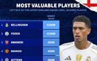 落选英格兰名单身价榜:贝林厄姆1.8亿居首,福登、梅努在列